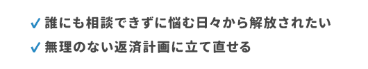 何をどうしていいかわからないまま相談をしてしまいましたが、ひとつひとつ丁寧に説明をしていただき、また、私の話も親身になって聞いてくださいました。生活再建の方法があると分かって、まずは一安心しました。